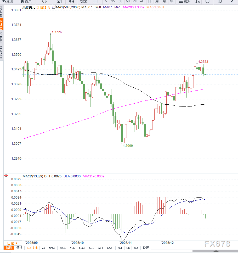 从技术面看,英镑兑美元日线仍处于高位震荡结构。汇价此前在1.35关口附近反复受阻,显示该区域存在较强技术性压力。